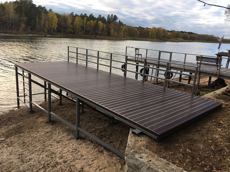 При установке фундамента причала на водоёме с неровным дном используются сваи разной длины. Это делается, чтобы выровнять уровень свайного поля.